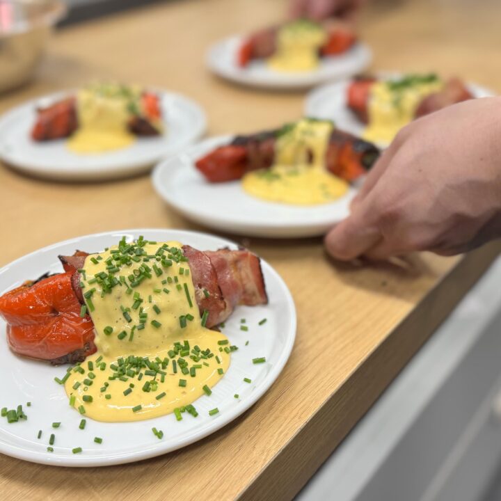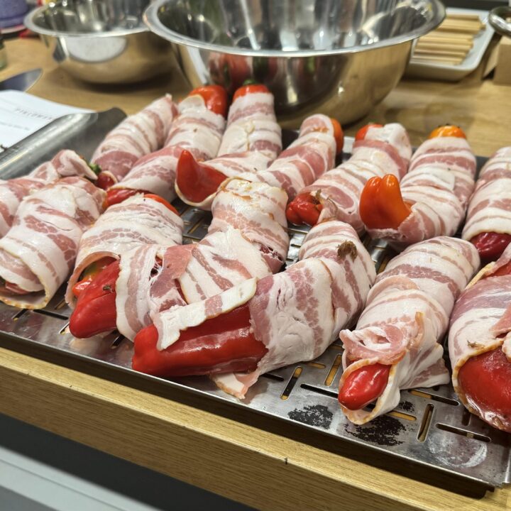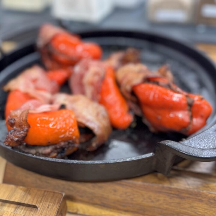 - Wędzone i grillowane papryki Ramiro – Mięsny klasyk w nowej odsłonie. Soczyste papryki Ramiro nadziewane wołowiną o głębokim, dymnym aromacie. Całość owinięta cienkimi plastrami chrupiącego boczku i wykończona gęstym, kremowym sosem serowym, który otula każdy kęs aksamitną intensywnością.