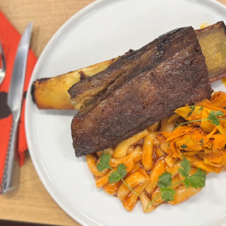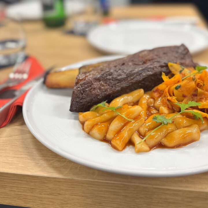 - Short Beef Ribs z Tteokbokki i koreańskimi piklami z dyni – Powoli grillowane żeberka wołowe o cudownie rozpływającym się mięsie, z błyszczącą glazurą i nutą dymu. Do tego koreańskie Tteokbokki – lekko pikantne kluski ryżowe o sprężystej teksturze oraz pikle z dyni, które dodają słodyczy i świeżości. Orientalny twist w najlepszym, grillowym wydaniu.