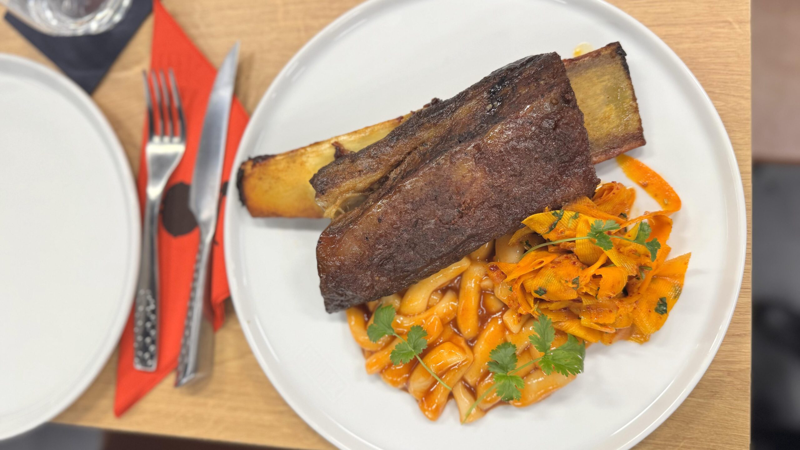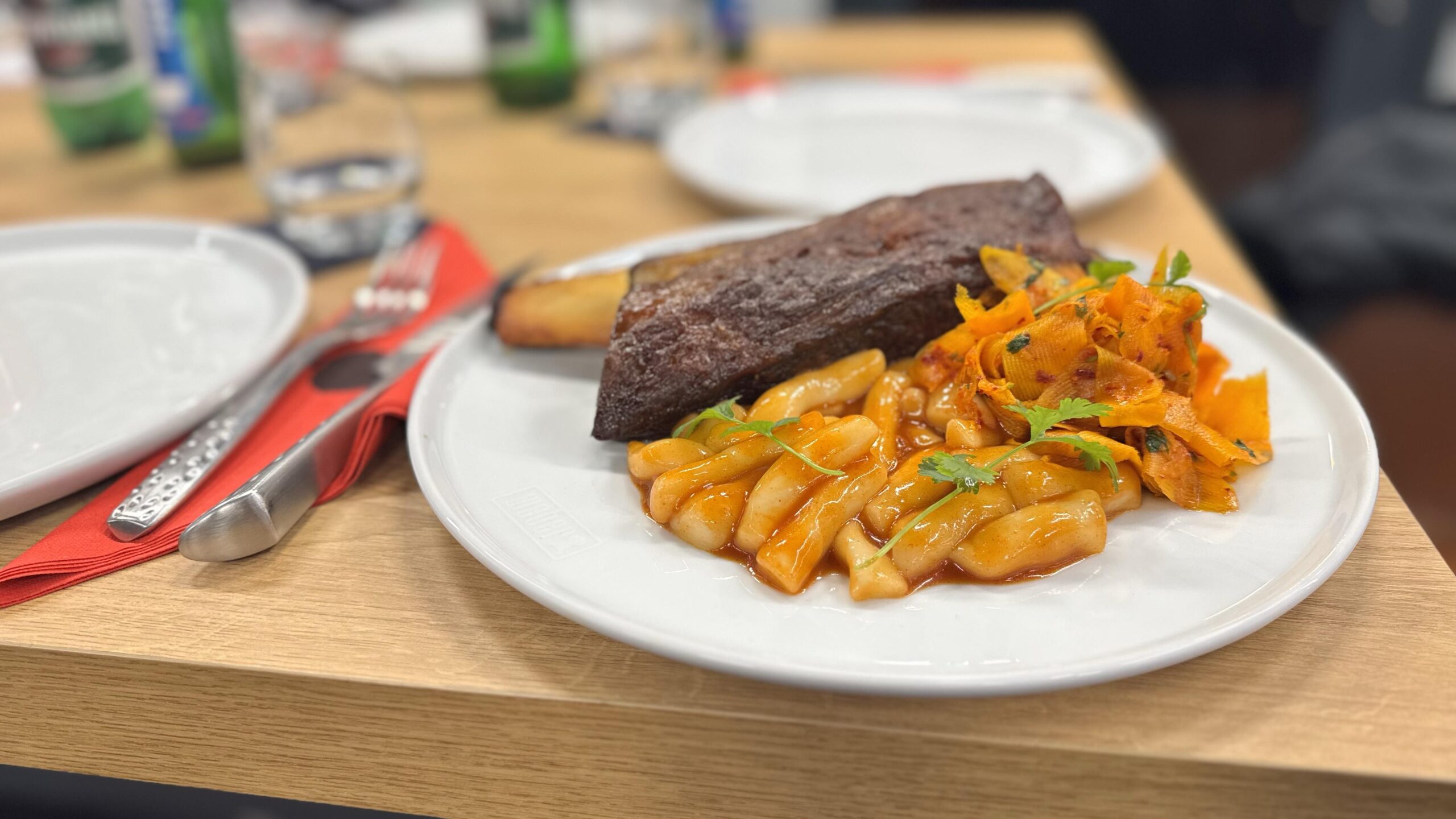 - Short Beef Ribs z Tteokbokki i koreańskimi piklami z dyni – Powoli grillowane żeberka wołowe o cudownie rozpływającym się mięsie, z błyszczącą glazurą i nutą dymu. Do tego koreańskie Tteokbokki – lekko pikantne kluski ryżowe o sprężystej teksturze oraz pikle z dyni, które dodają słodyczy i świeżości. Orientalny twist w najlepszym, grillowym wydaniu.