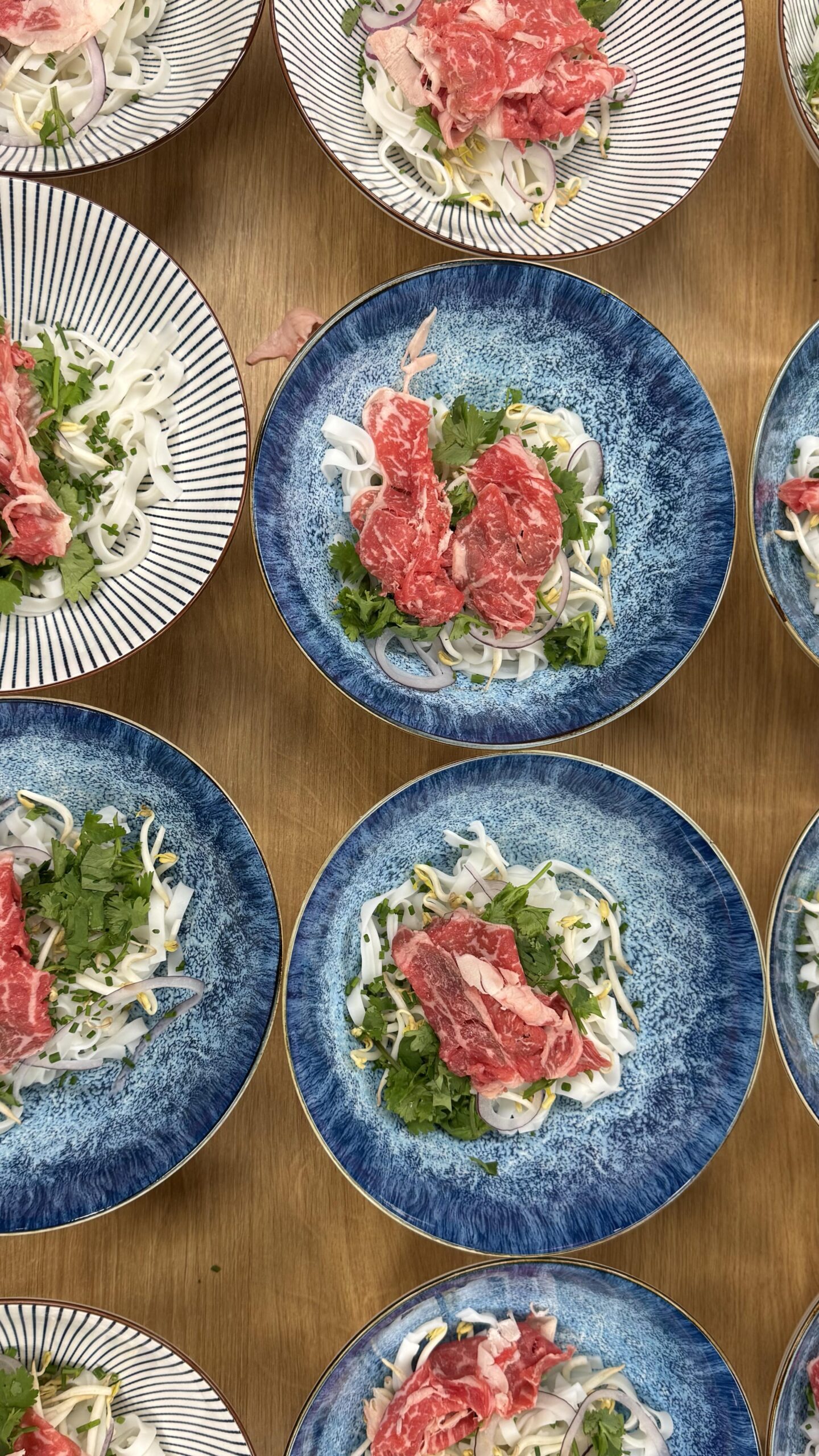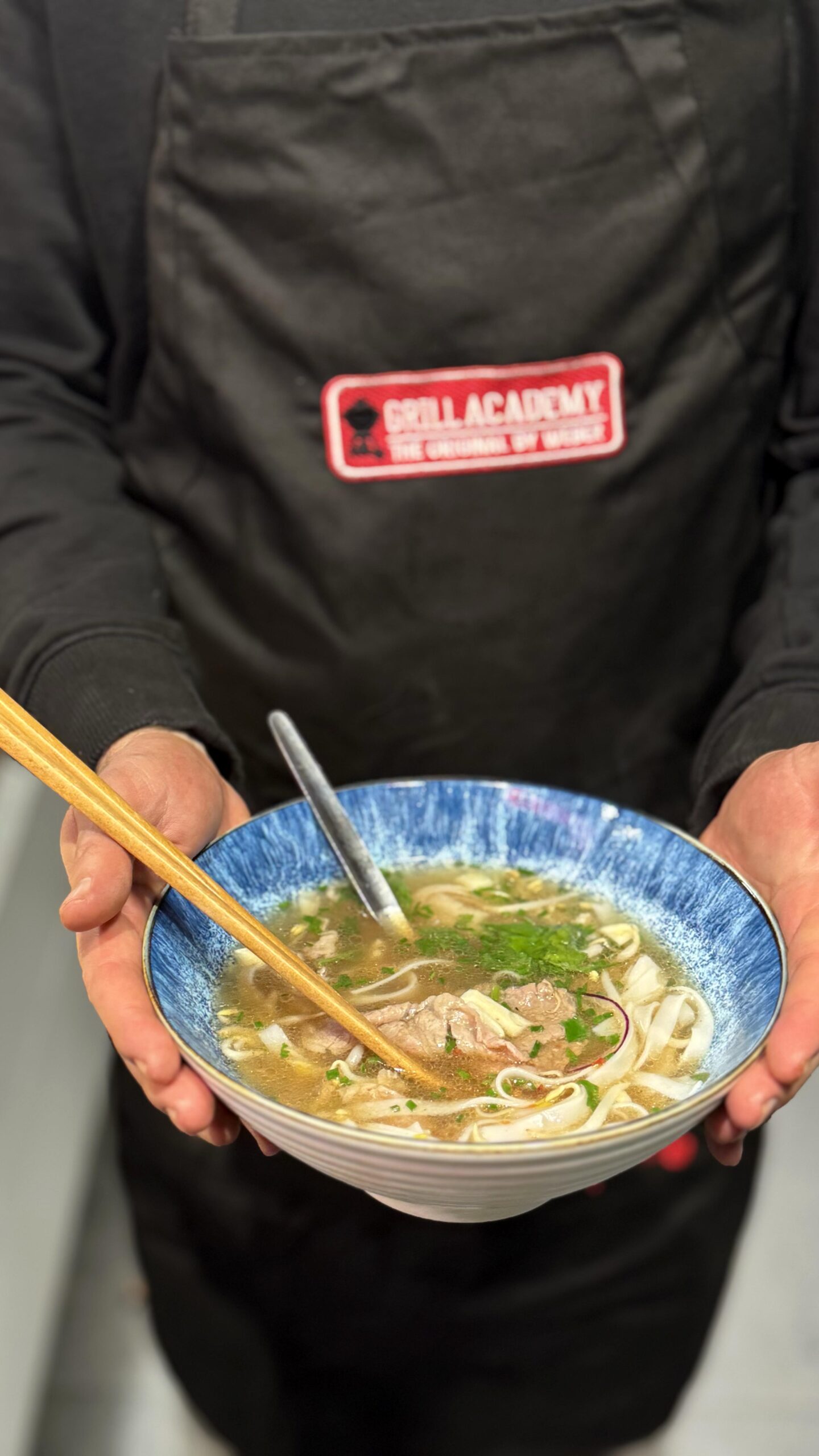 - Rozgrzewające Pho Bo Hanoi – Kulinarna podróż do Wietnamu prosto z grilla. Na ruszcie ląduje delikatna, grillowana wołowina, która trafia do głębokiego bulionu o bogatym, przyprawowym profilu. Towarzyszą jej makaron ryżowy, świeże zioła i odrobina limonki – wszystko razem tworzy rozgrzewający, aromatyczny balans, który koi i pobudza jednocześnie.